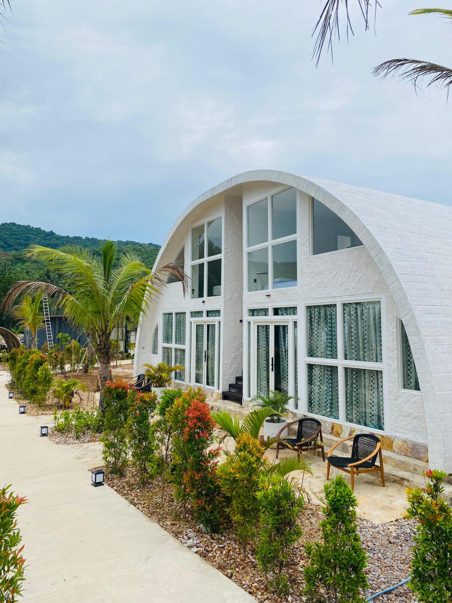 Ceritakan tentang desain bangunan resort. Apakah menggunakan kayu daur ulang? Apakah ada ukiran khusus? Ceritakan bagaimana bangunan menyatu dengan alam sekitarnya tanpa merusaknya.